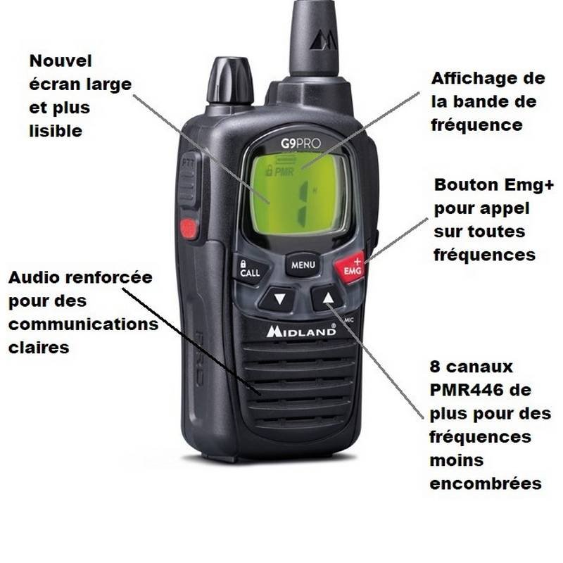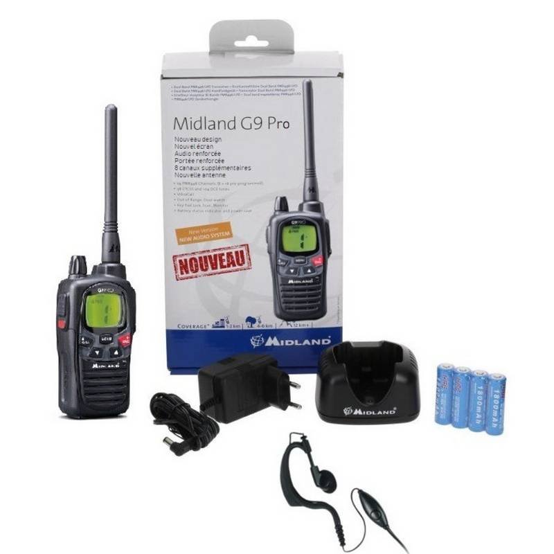 Le talkie-walkie G9 PRO en version noir et camouflage. Le plus célèbre des émetteurs-récepteurs bibande renouvelé et devient PRO. Avec écran LCD plus grand, audio amélioré, antenne optimisée, design revisité mais surtout. Le Midland G9 PRO dispose de 8 nouveaux canaux PMR446 : de 446.0Mhz à 446.2Mhz